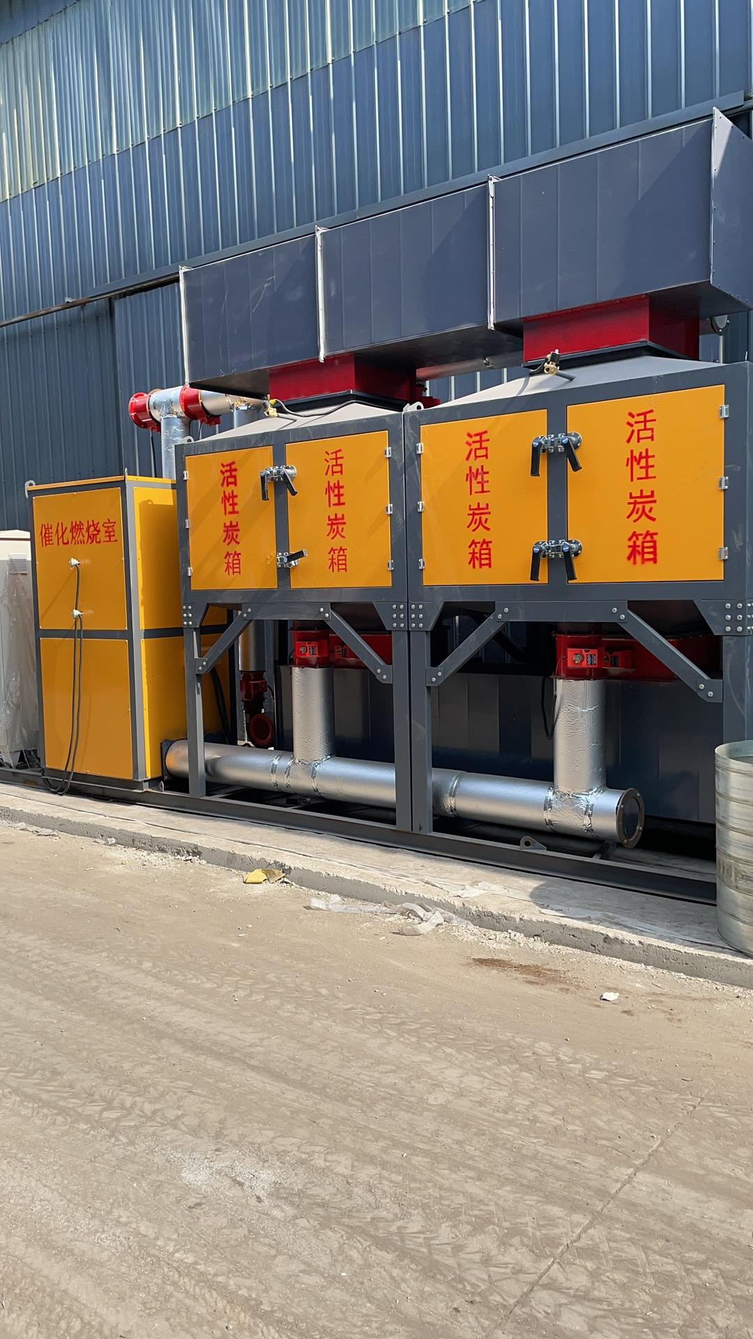 活性炭使用一段時間,吸附了一定量的溶劑后,會降低或失去吸附能力,此時活性炭需脫附再生,再生后活性炭重新恢復吸附功能可繼續(xù)使用。再生時,啟動催化燃燒裝置予熱室電源,將空氣予熱,予熱后的氣體送入吸附箱,箱中活性炭受熱后,活性炭吸附的溶劑揮發(fā)出來,溶劑經風機送入催化燃燒室燃燒,燃燒后分解生成CO2和H2O蒸汽等熱空氣,熱空氣一部分回到活性炭吸附箱繼續(xù)給活性炭加熱,叧一部分排空,熱空氣內部循環(huán)多次活性碳即可得到再生。