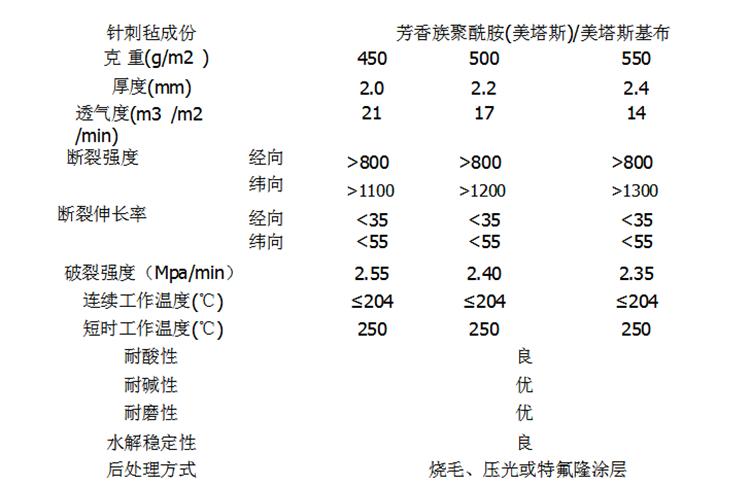 注: 1 、美塔斯耐高溫針刺過濾氈性能測試表見附表